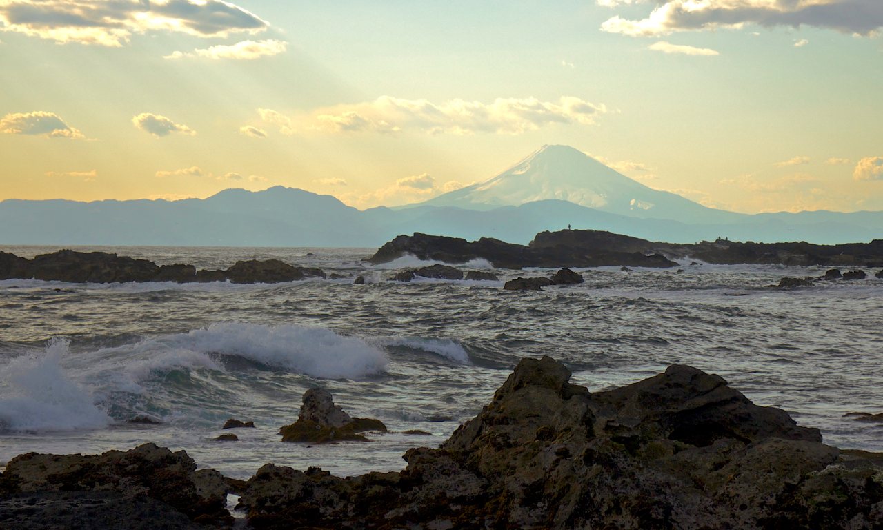 Jogashima (城ヶ島) is a beautiful small island made of volcanic rock on the southern coast of the Miura peninsula one hour South East of Yokohama. The tiny island lies opposite of the tuna port Misaki (三崎) and is famous for a breathtaking sunset with Mount Fuji in the background.