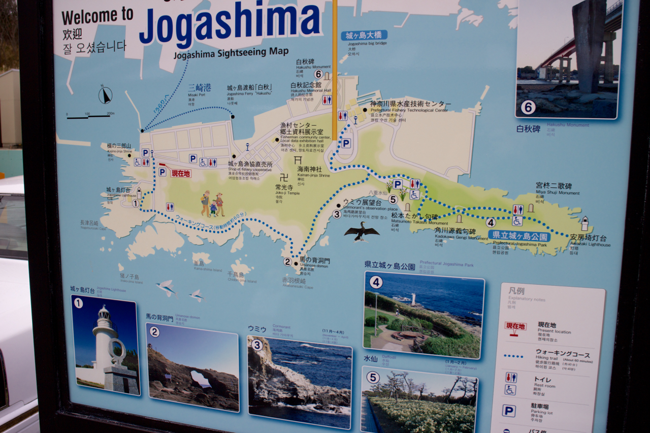 From the Urari dock in Misaki there is a small ferry boat that makes the crossing to Jogashima in about 10 minutes. The map here below gives a good overview of the island, the hiking trail and the sightseeing spots.
